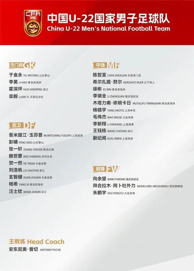 年初折戟于U20亚青赛的那支队伍,虽然没能实现既定目标,但队中多名球员的能力和球队的技战术水平还是得到了广泛认可,足协还希望能继续重点培养这批队员。所以,3月份踢“U22盐城四国邀请赛”的那支U22队伍中就选入了U20国青的大部分主力球员,只缺了已入选国家队的王钰栋、刘诚宇等少数几名。如今国家队赛事已了,所以王钰栋得以入队,只不过刘诚宇或因安东尼奥另有考虑而没能入选。